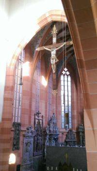 Leben und Sterben stehen in der Wertheimer Stiftskirche mit ihrem überlebensgroßen Kruzifix und der Vielzahl an Grabdenkmälern und Grabplatten im Mittelpunkt. Die reich dekorierten Grabmäler betonen die Vergänglichkeit des Menschen. Ihre prunkvollen Ausstattungen sind Glaubenszeugnisse im Angesicht der Vergänglichkeit.