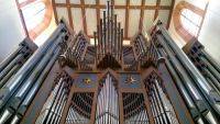 Im Westen thront die Orgel aus dem 20. Jahrhundert auf der hölzernen Empore. Die Geschichte der Orgel ist eng mit der Geschichte der konfessionellen Unterschiede verbunden. Bis zum 17. Jahrhundert befand sich die Orgel als „Schwalbennest“ an der nördlichen Längsseite der Kirche. 1663 sollte die Orgel renoviert und die Kosten von der protestantischen und der katholischen Gemeinde getragen werden. Der Streit entbrannte, als die evangelische Gemeinde vorschlug, eine große Orgel auf der Westempore zu errichten. Die katholische Gemeinde weigerte sich, sodass das Reichskammergericht in Regensburg und der Reichshofrat in Wien entscheiden mussten. Und die neue Orgel fand ihren Platz auf der Westempore.